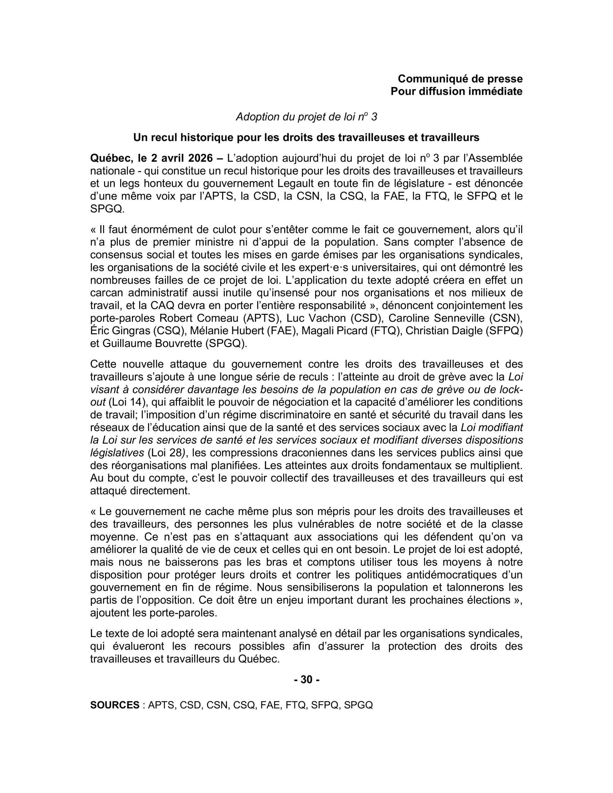 Communiqué FAE – Adoption du PL3 – Un recul historique