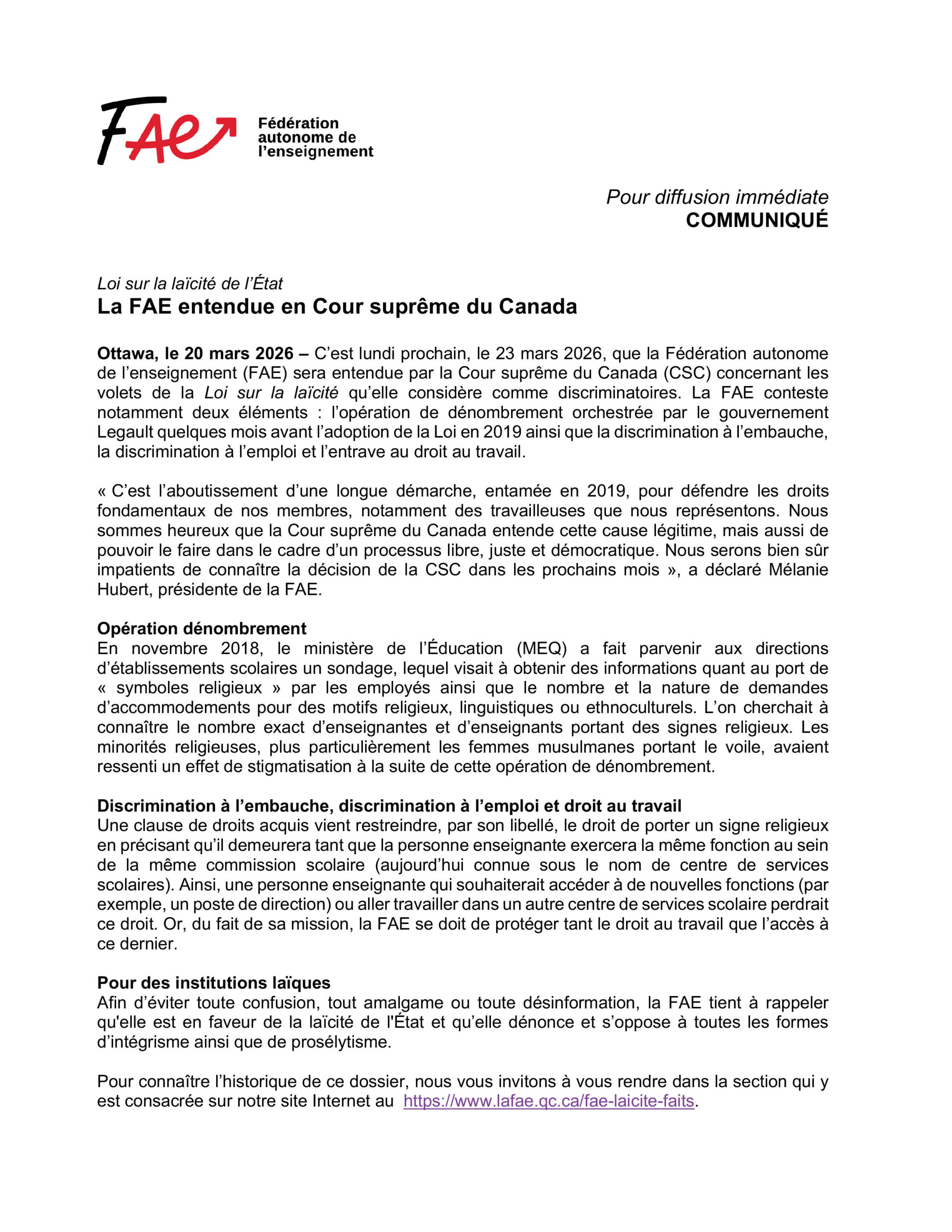 Communiqué FAE – LA FAE entendue en Cour suprême