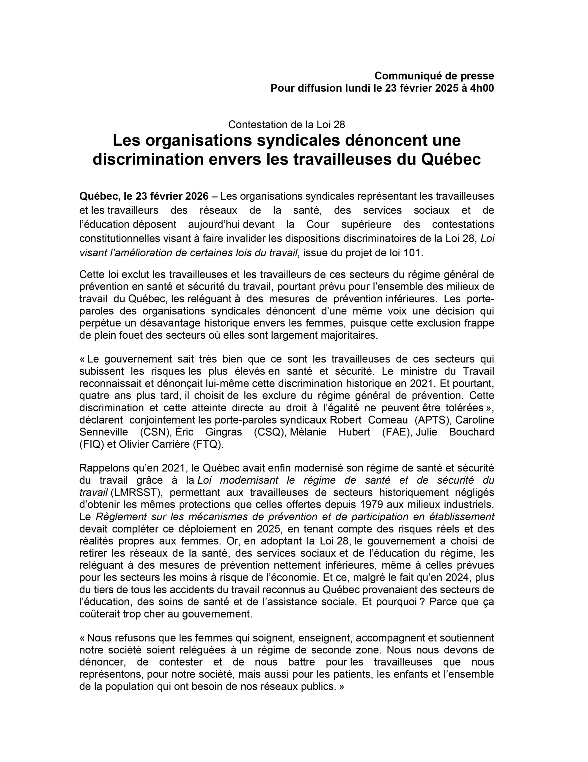 Contestation de la Loi 28 – communiqué de presse intersyndical
