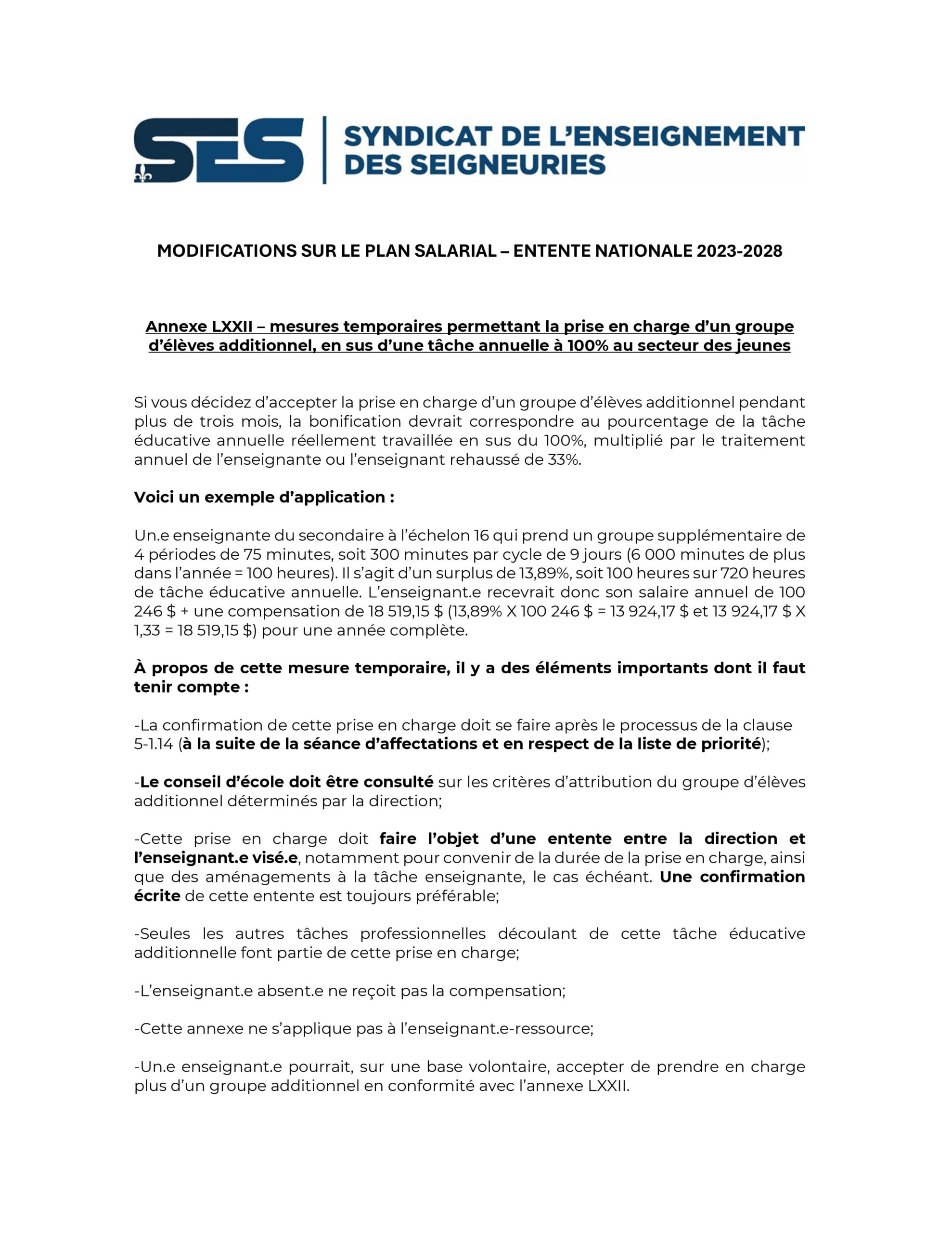 Modifications sur le plan salarial – Entente nationale 2023-2028