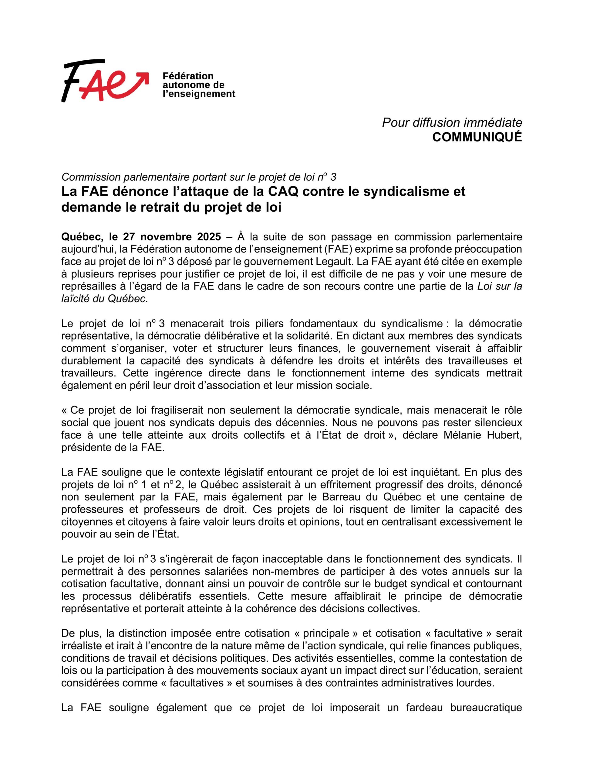 PL3: La FAE dénonce l’attaque de la CAQ contre le syndicalisme et demande le retrait du projet de loi