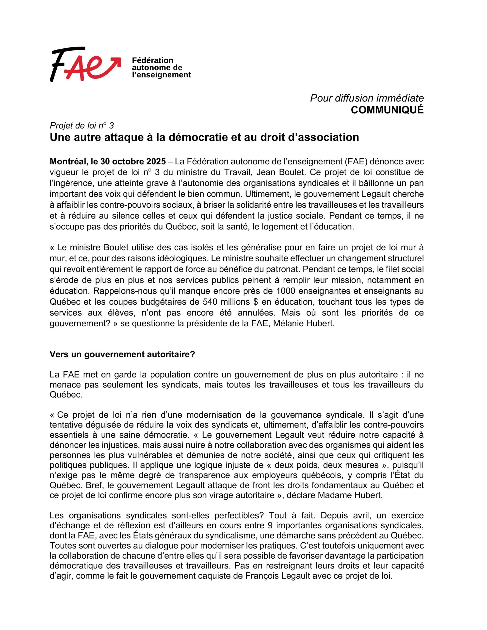 La Fédération autonome de l’enseignement (FAE) dénonce avec vigueur le projet de loi no 3 du ministre du Travail, Jean Boulet….